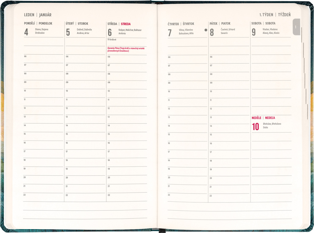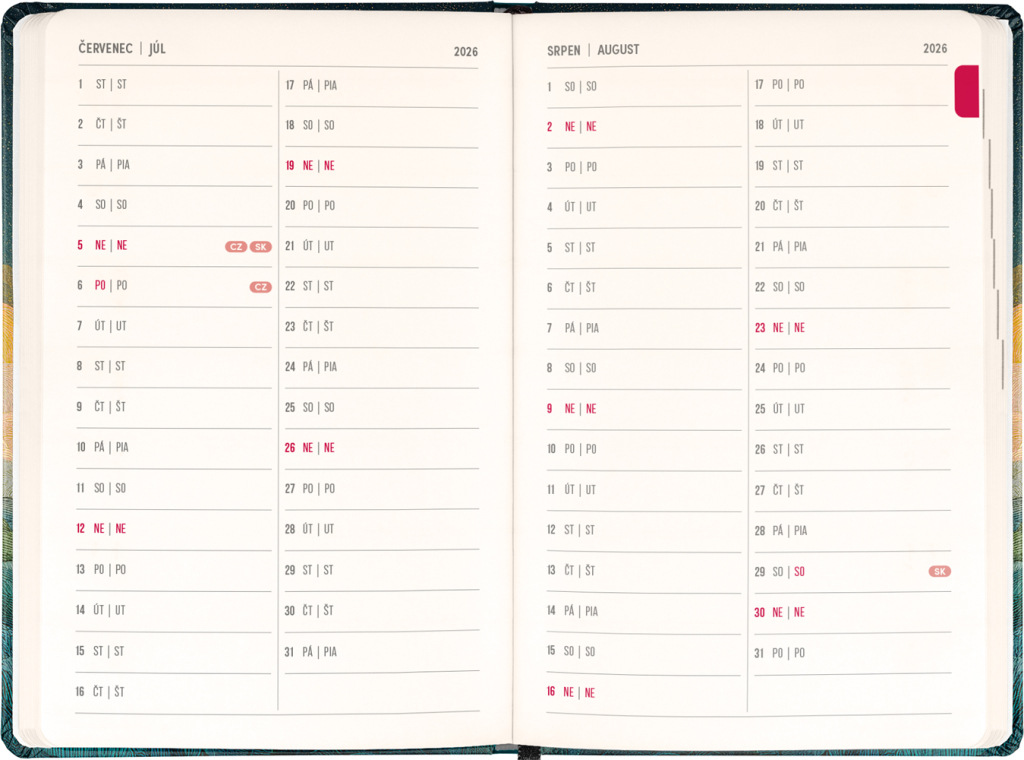 Osemnásťmesačný diár obsahuje prehľad na roky 2026 a 2027, zoznam českých a slovenských mien a česko-slovenský týždenný stĺpcový kalendár s menami a sviatkami. Kalendár začína v júli 2026 a končí v decembri 2027