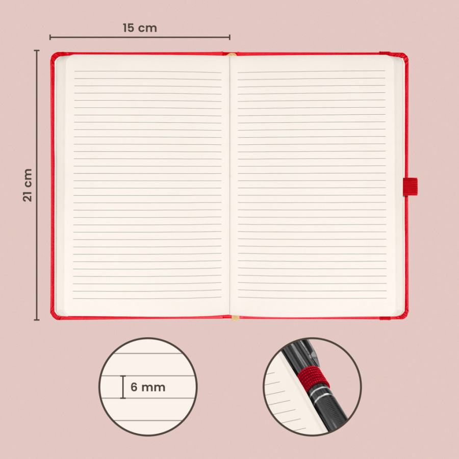 Linajkový notes Aprint 2025 v červenom prevedení. Klasika i elegancia, najžiadanejší povrch, na ktorý možno ľahko vyraziť firemné logá s jemnou štruktúrou.