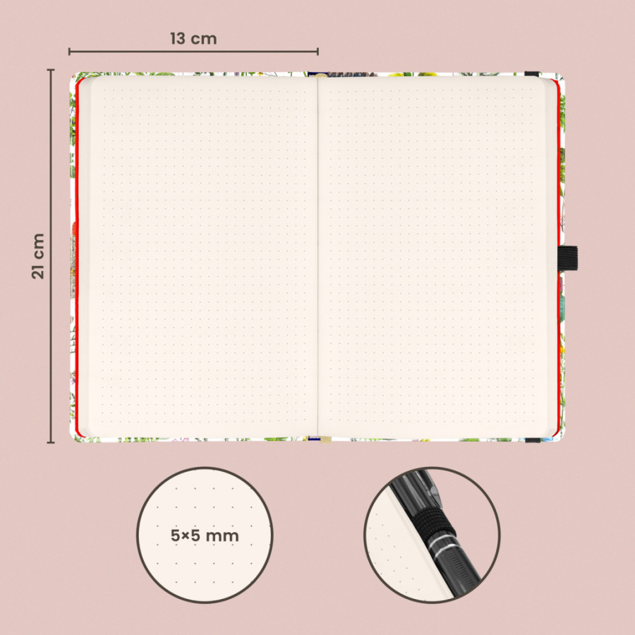Notes v pevných doskách z kolekcie Kateřiny Winterovej s nostalgickými obrázkami byliniek, s uzatváraním na gumičku, vreckom na drobnosti a pútkom na ceruzku. Vo vnútri nájdete 172 bodkovaných strán na žltom papieri na zapisovanie všetkých nápadov.