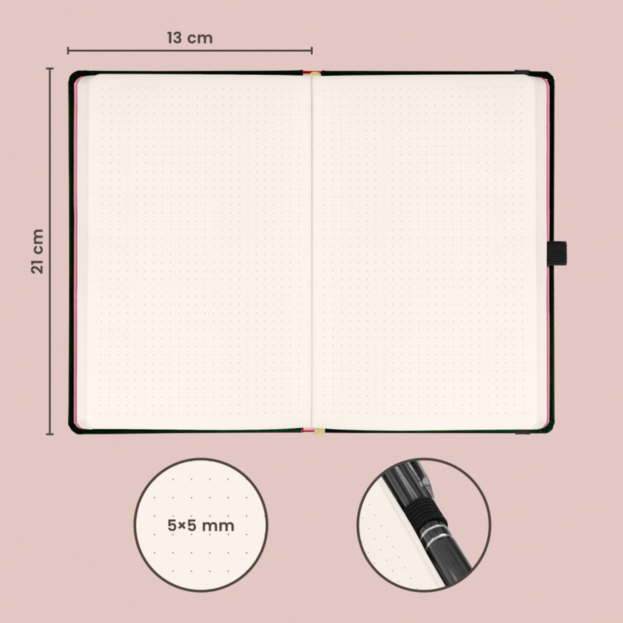 Notes v pevných doskách z kolekcie Kateřiny Winterovej s motívom ruže, s uzatváraním na gumičku, vreckom na drobnosti a pútkom na ceruzku. Vo vnútri nájdete 172 bodkovaných strán na žltom papieri na zapisovanie všetkých nápadov.