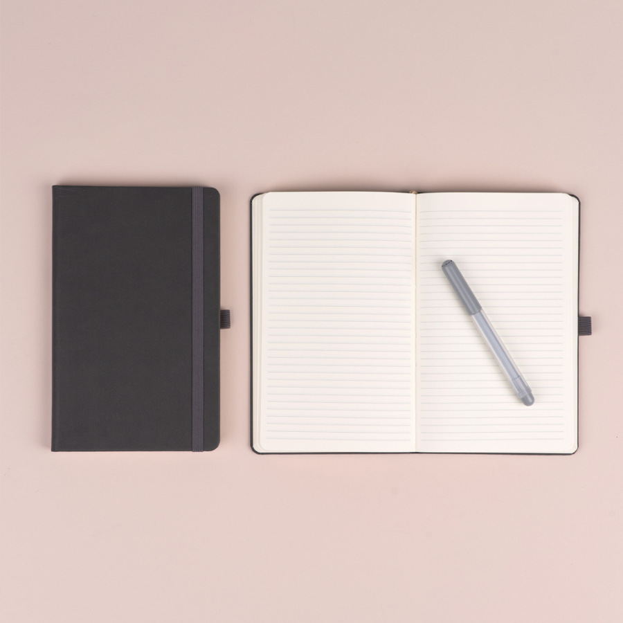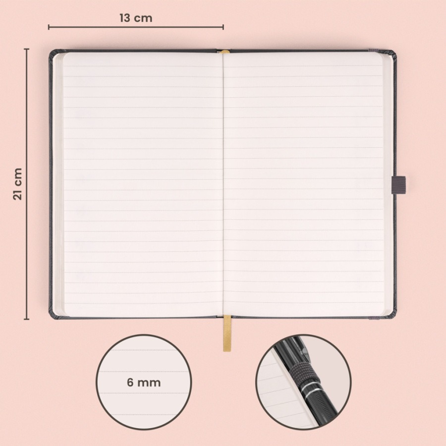 Praktický a ľahký linajkovaný notes v klasickej sivej farbe má povrch s hrubšou štruktúrou, na ktorý si môžete nechať vyraziť logo spoločnosti. Notes má pevnú knižnú väzbu a zaoblené rohy, pútko na pero, elastickú gumičku a textilnú záložku. Linajky majú 6 mm a sú na kvalitnom žltom papieri.
