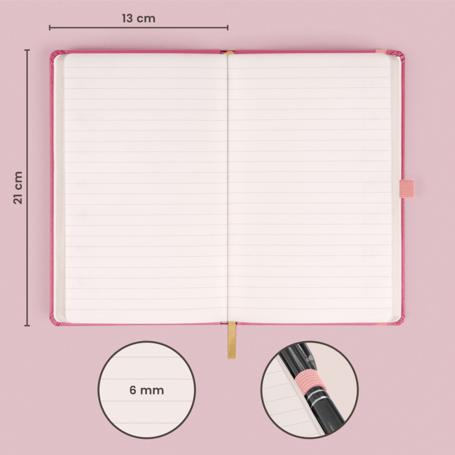 Praktický a ľahký linajkovaný notes v trendy ružovej farbe má povrch s jemnou štruktúrou, na ktorý si môžete nechať vyraziť logo spoločnosti. Notes má pevnú knižnú väzbu a zaoblené rohy, pútko na pero, elastickú gumičku a textilnú záložku. Linajky majú 6 mm a sú na kvalitnom žltom papieri.