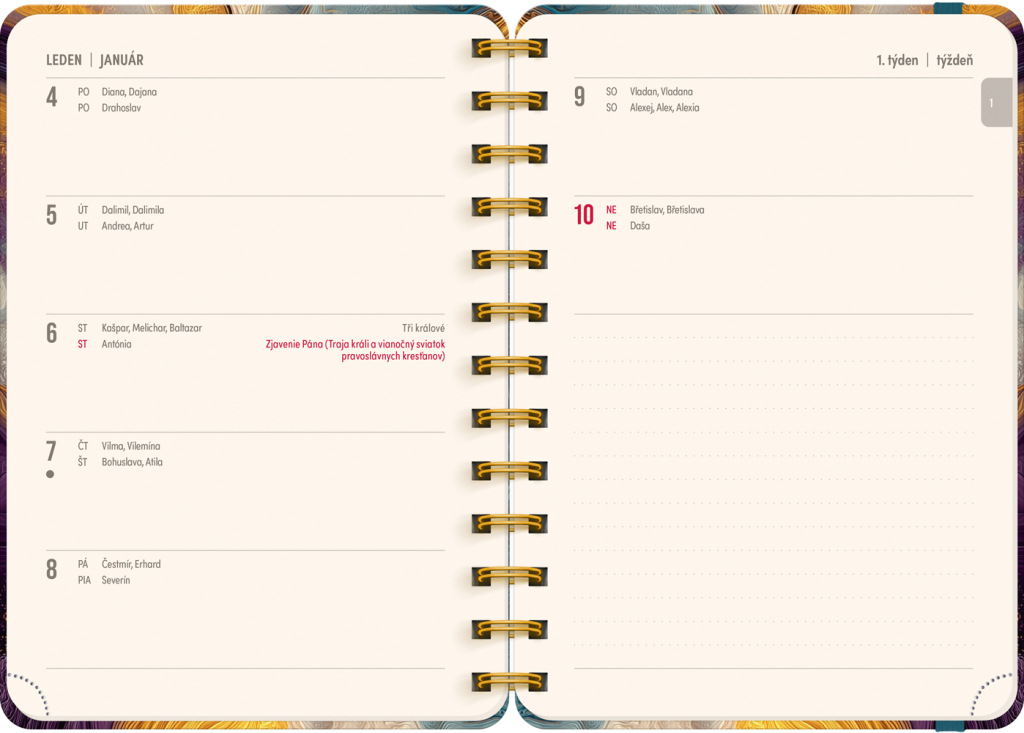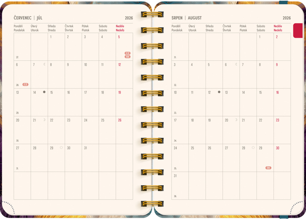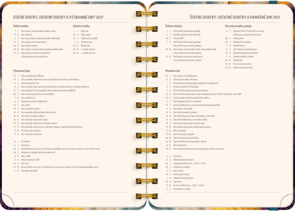 Osemnásťmesačný diár obsahuje prehľad na roky 2026 a 2027, zoznam českých a slovenských mien, česko-slovenský týždenný riadkový kalendár s menami a sviatkami a priestor na poznámky v každom týždni. Kalendár začína v júli 2026 a končí v decembri 2027.