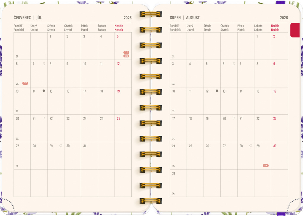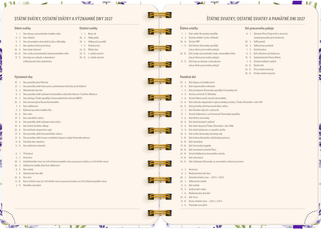 Osemnásťmesačný diár obsahuje prehľad na roky 2026 a 2027, zoznam českých a slovenských mien, česko-slovenský týždenný riadkový kalendár s menami a sviatkami a priestor na poznámky v každom týždni. Kalendár začína v júli 2026 a končí v decembri 2027.