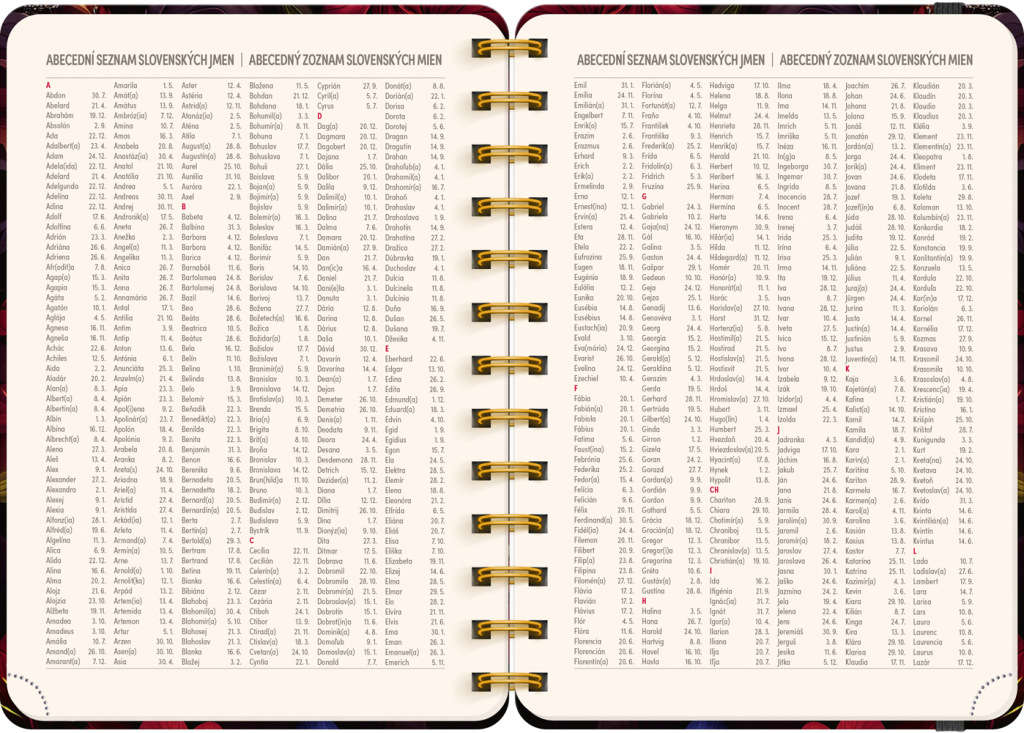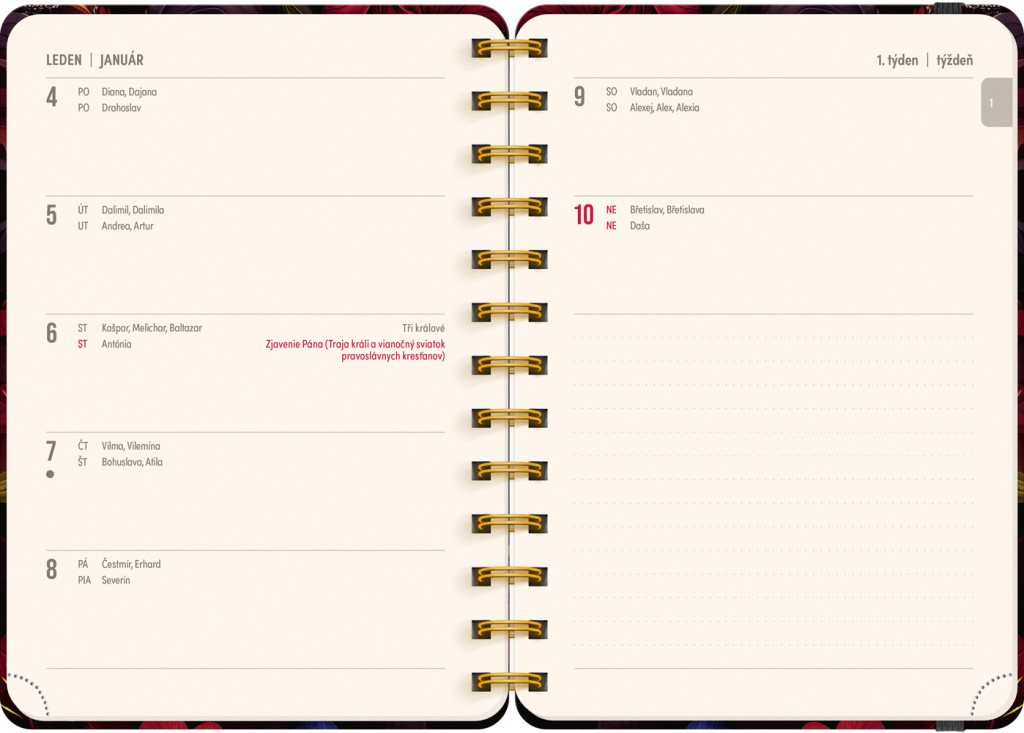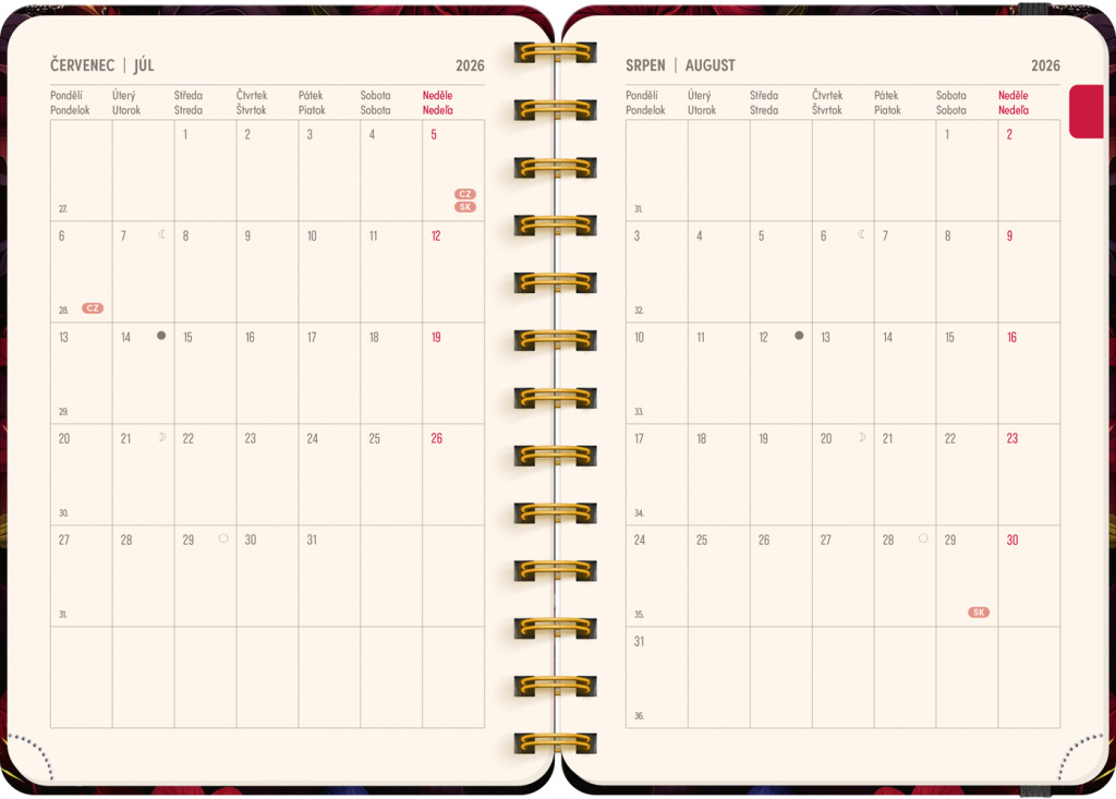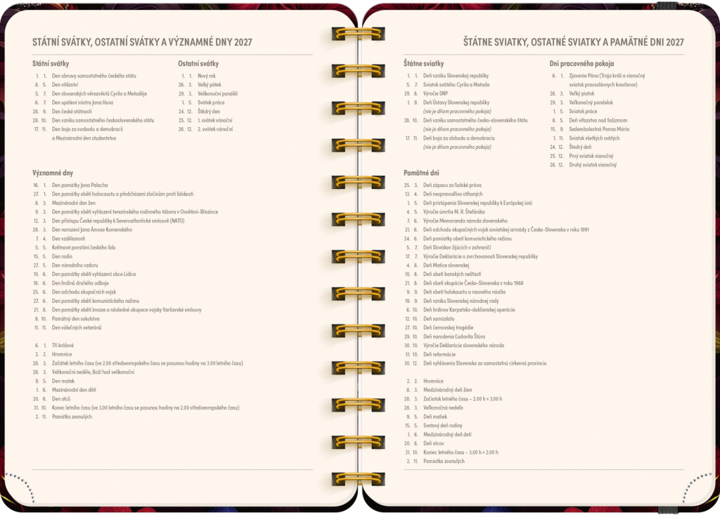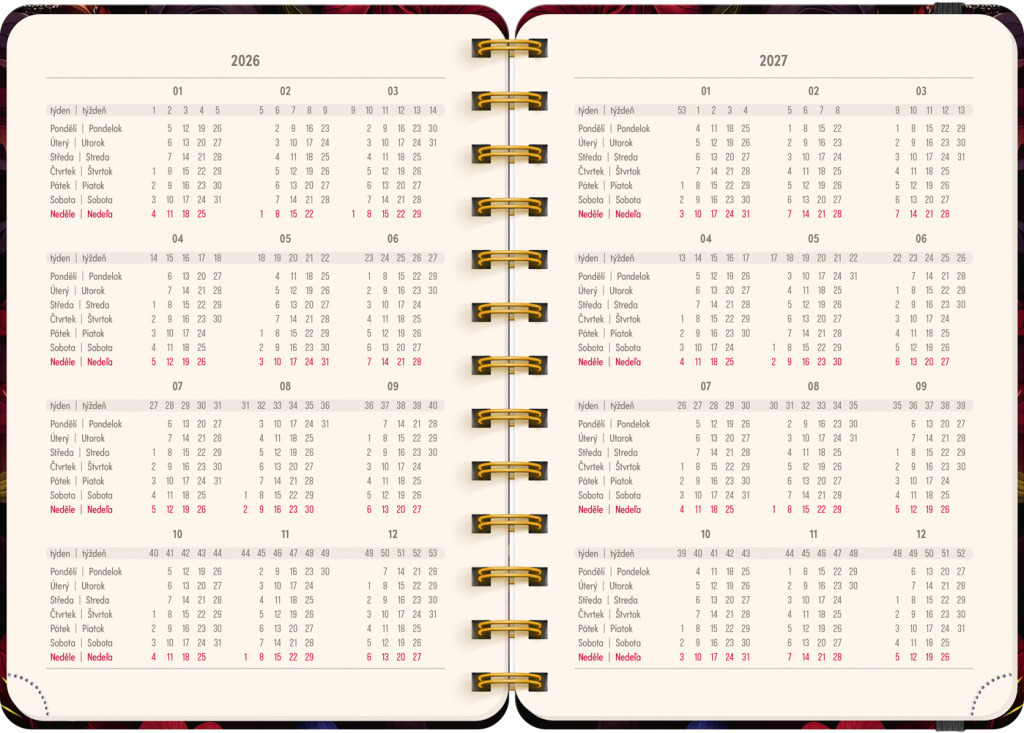 Osemnásťmesačný diár obsahuje prehľad na roky 2026 a 2027, zoznam českých a slovenských mien, česko-slovenský týždenný riadkový kalendár s menami a sviatkami a priestor na poznámky v každom týždni. Kalendár začína v júli 2026 a končí v decembri 2027.