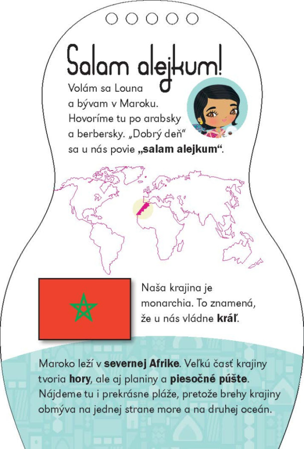 Ďalší titul obľúbenej série, ktorá našla svojich obdivovateľov už v temer tridsiatich krajinách sveta, predstavuje malým čitateľom kúzlo Orientu prostredníctvom bábiky Louny. Kreatívne maľovanky, plno samolepiek… knižka obsahuje všetko potrebné na vytvorenie nespočetných modelov podľa marockej módy. A navyše sa deti dozvedia aj mnoho zaujímavých informácií! Ako sa ich vrstovníci v Maroku zdravia, ako sa tam učia, na akých špecialitách si pochutnávajú? Viete, čo je to tažín alebo ako vyzerá jellaba? To všetko a ešte omnoho viac sa dozviete, ak sa vydáte za poznaním s našimi bábikami. A ku každej knižke dostanete navyše krásny náramok pre šťastie!