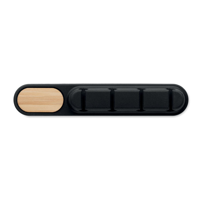Silikonový organizér na kabely s detaily z přírodního bambusu. Kompaktní oválný design udržuje kabely bezpečné uklizené.