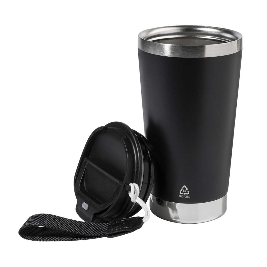 Dvojstenný termo hrnček z recyklovanej nerezovej ocele s viečkom na pitie z PP a popruhom na prenášanie v zodpovedajúcej farbe. 430 ml.