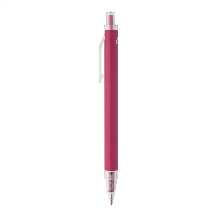 Guľôčkové pero z recyklovaného hliníka s matným telom a priehľadnými RPET časťami. S modrou náplňou.