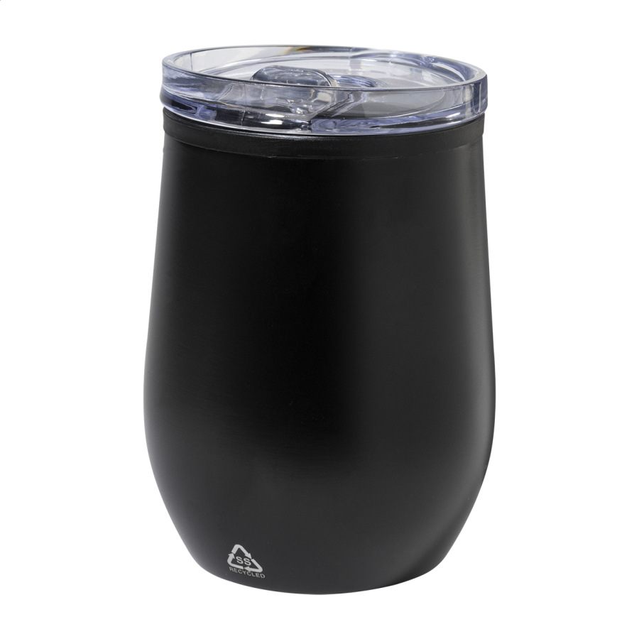 Dvojstenný termo hrnček z recyklovanej nerezovej ocele s vnútornou stranou z PP a viečkom z PS. 350 ml.
