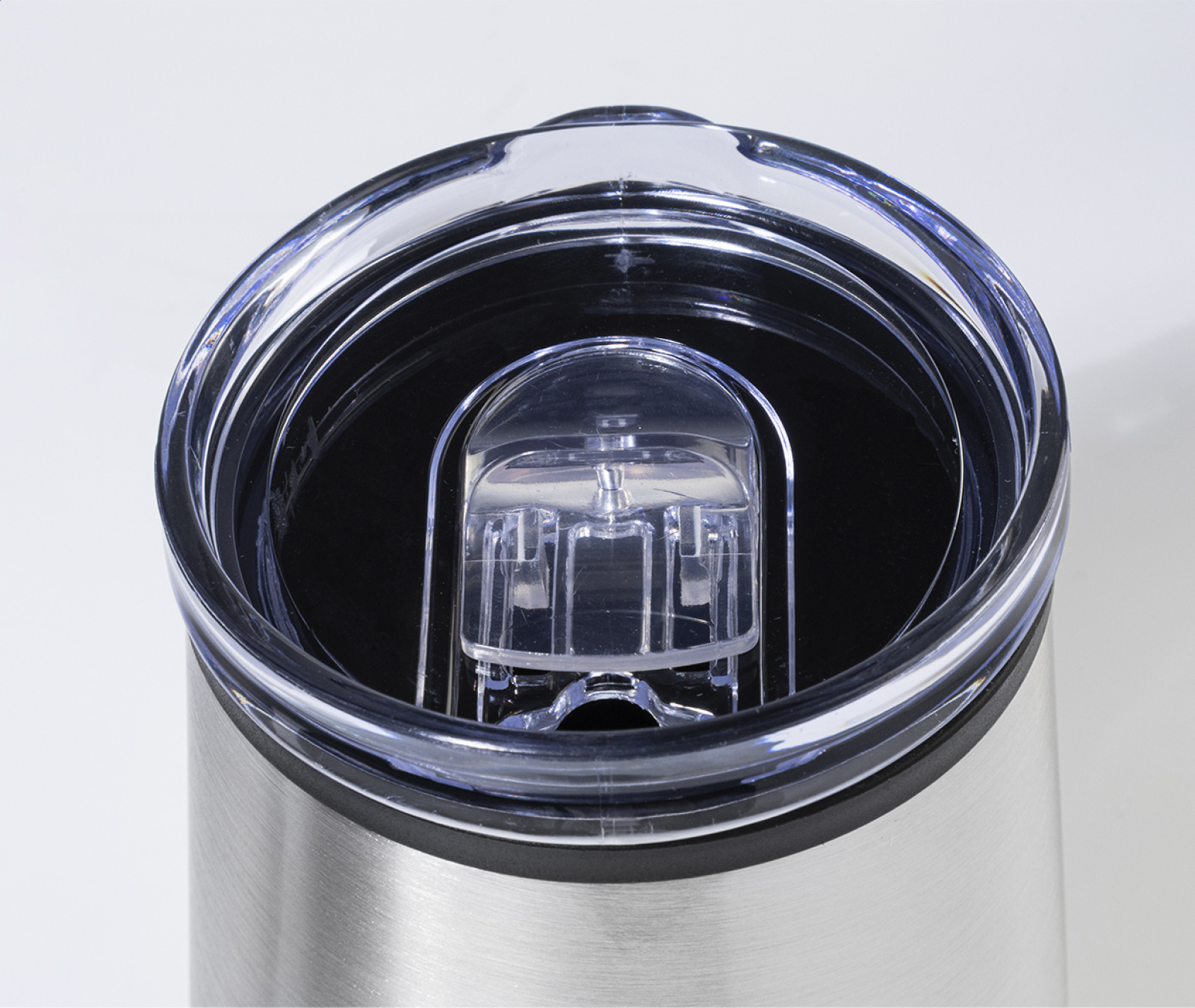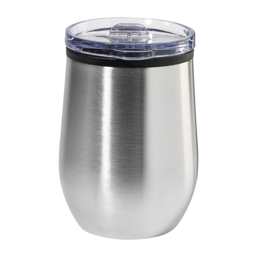 Dvojstenný termo hrnček z recyklovanej nerezovej ocele s vnútornou stranou z PP a viečkom z PS. 350 ml.