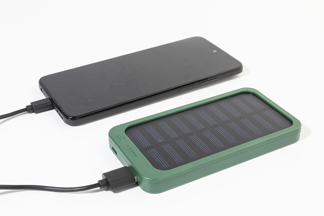 Power banka z recyklovaného ABS plastu so vstavanou solárnou nabíjačkou a batériou 4000 mAh. S 1 USB a 1 USB-C portom na nabíjanie. Vstupný port USB-C. Vrátane nabíjacieho kábla USB.