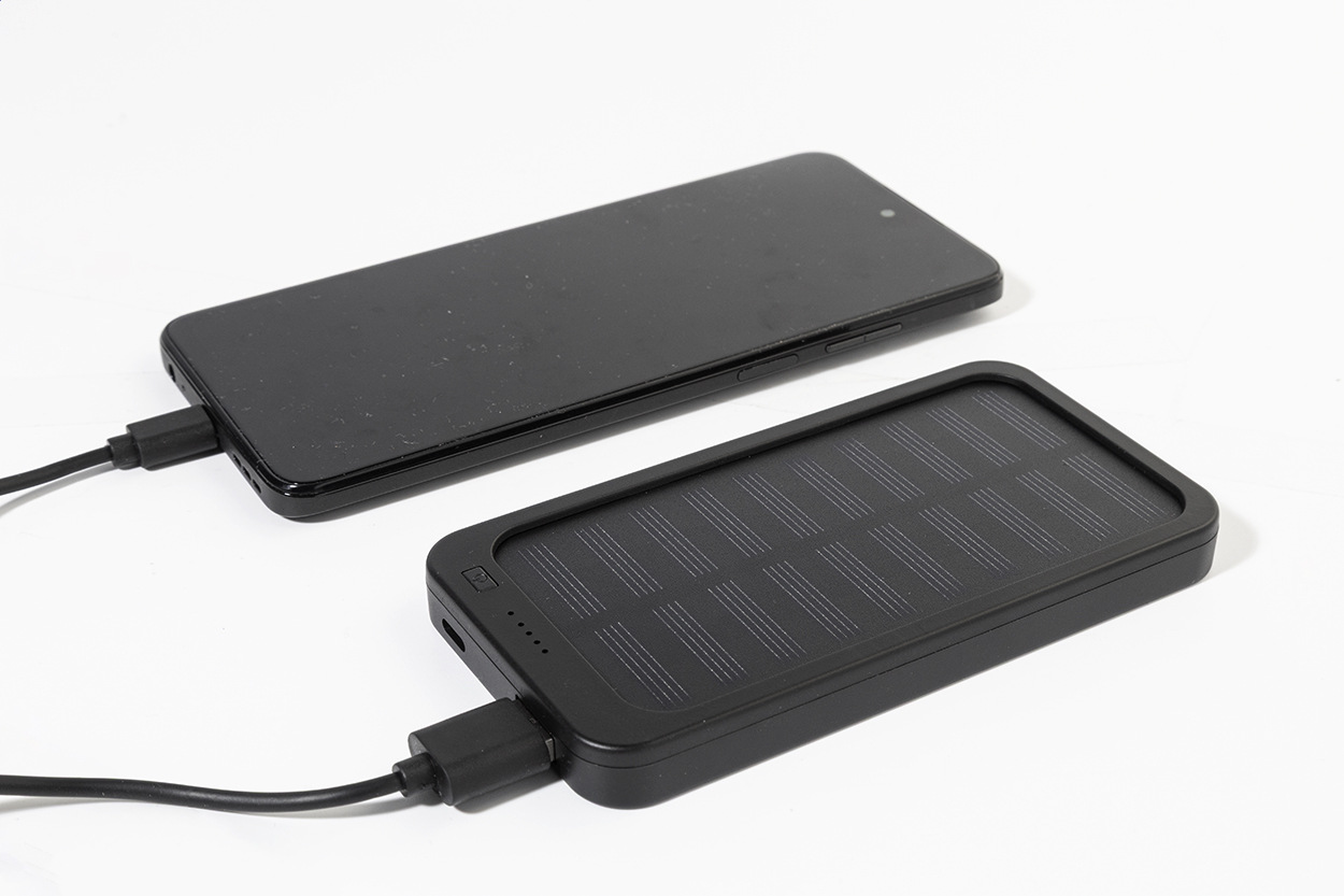Power banka z recyklovaného ABS plastu so vstavanou solárnou nabíjačkou a batériou 4000 mAh. S 1 USB a 1 USB-C portom na nabíjanie. Vstupný port USB-C. Vrátane nabíjacieho kábla USB.