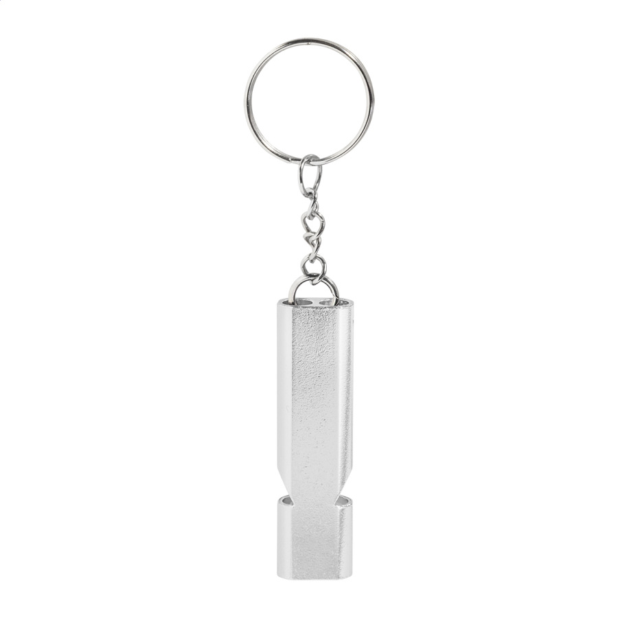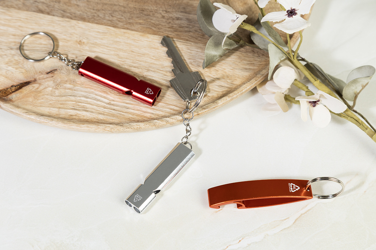 Píšťalka z recyklovaného hliníka s kovovým krúžkom na kľúče.