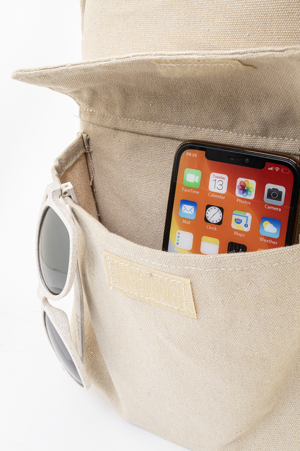 Batoh z recyklovaného plátna s hlavnou priehradkou na zips, polstrovanou priehradkou na notebook (13") a predným vreckom na suchý zips. 70% recyklovanej bavlny a 30% RPET polyesteru. S výraznou etiketou o recyklovanej bavlne.