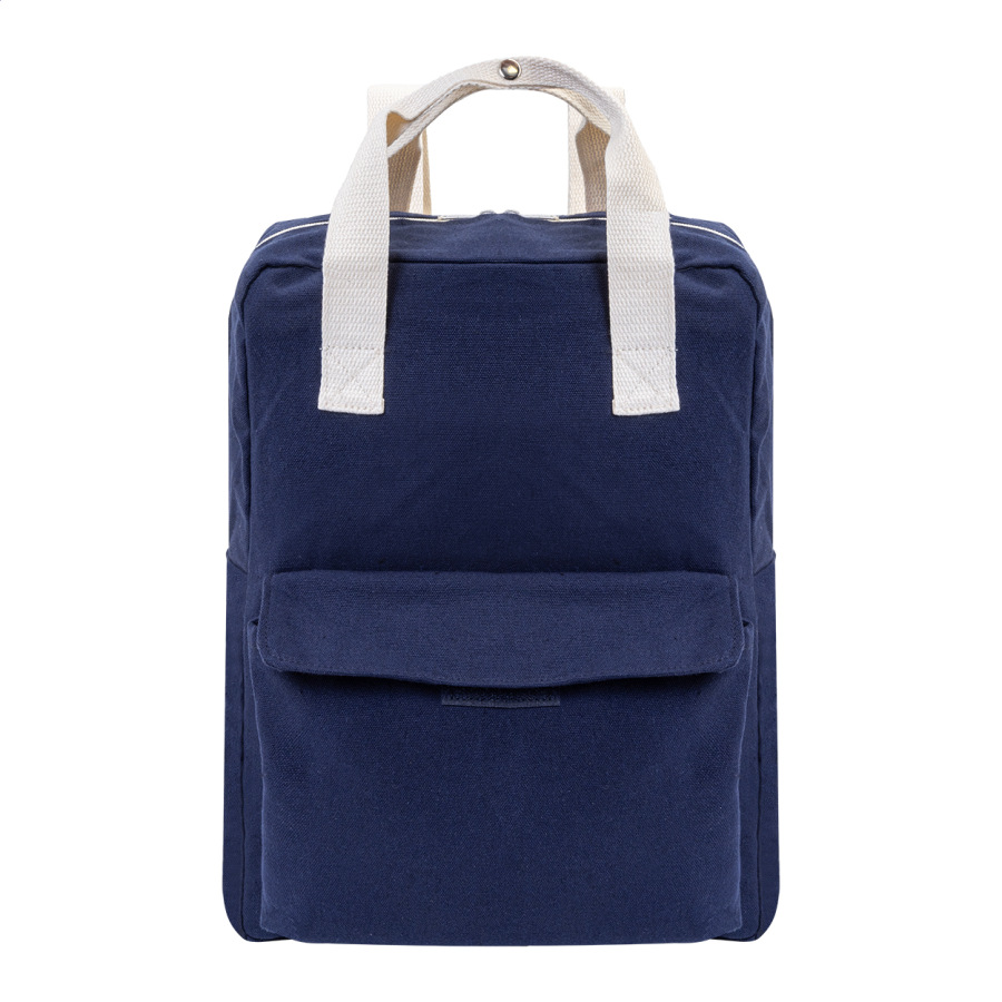 Batoh z recyklovaného plátna s hlavnou priehradkou na zips, polstrovanou priehradkou na notebook (13") a predným vreckom na suchý zips. 70% recyklovanej bavlny a 30% RPET polyesteru. S výraznou etiketou o recyklovanej bavlne.