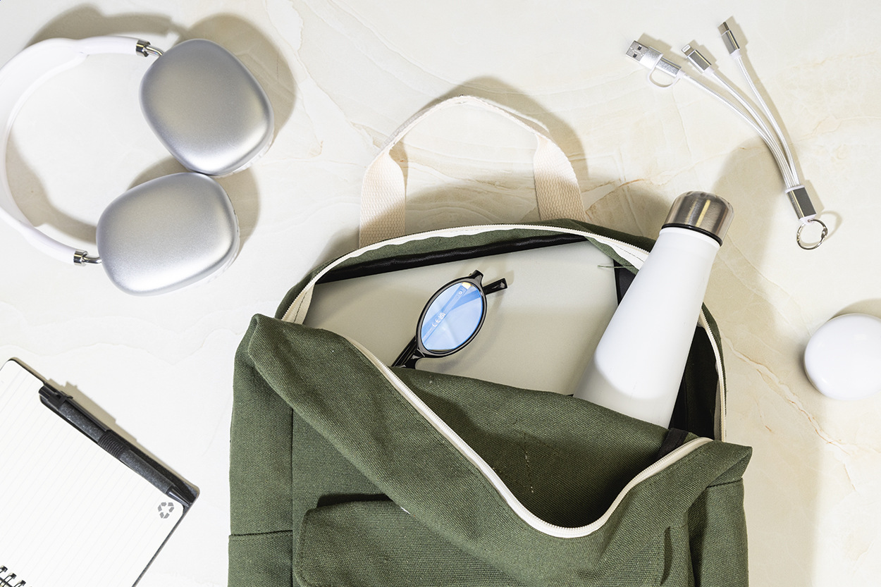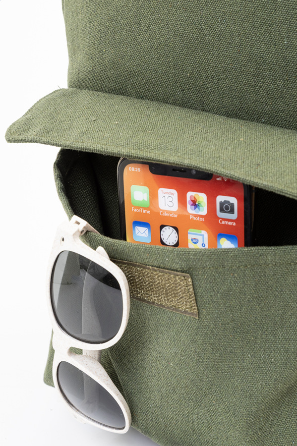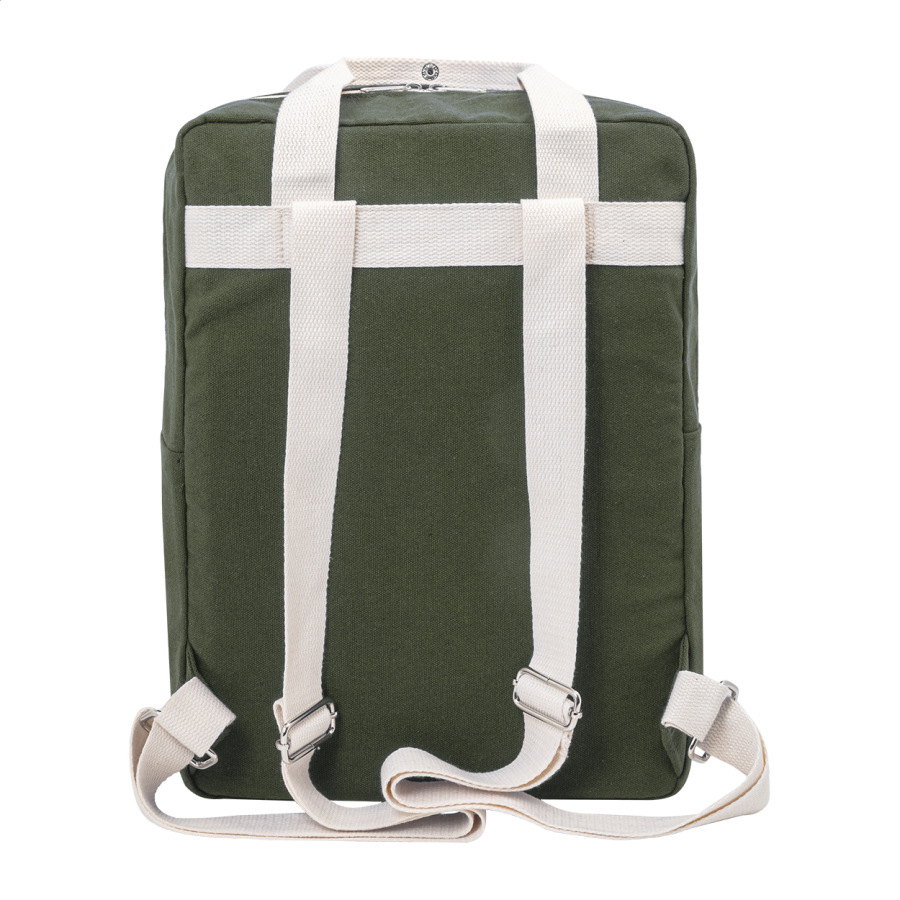 Batoh z recyklovaného plátna s hlavnou priehradkou na zips, polstrovanou priehradkou na notebook (13") a predným vreckom na suchý zips. 70% recyklovanej bavlny a 30% RPET polyesteru. S výraznou etiketou o recyklovanej bavlne.