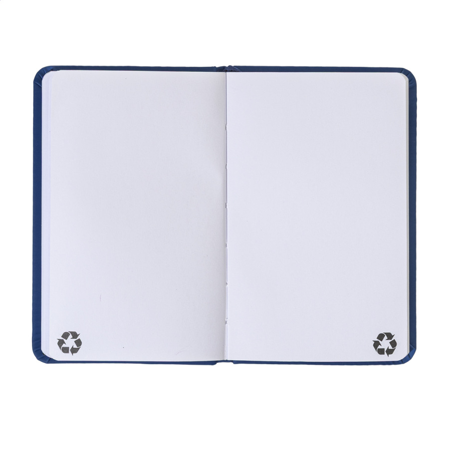 Blok A5 z recyklovanej PU kože so 100 čistými listami z recyklovaného papiera. So záložkou v zodpovedajúcej farbe a gumičkou.