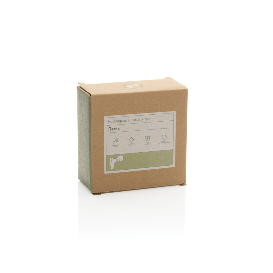 Zažite presnosť a komfort s masážnou pištoľou Revix. Tento inovatívny dizajn v kombinácii s prémiovými materiálmi poskytuje silnú úľavu a relaxáciu. Kompaktná veľkosť a ľahká konštrukcia robia z masážnej pištole ideálne riešenie na regeneráciu na cestách alebo doma. Vysokovýkonná lítium-iónová batéria poskytuje až 3,5 hodiny prevádzky na jedno nabitie, čo zabezpečuje nepretržité masáže pre maximálny komfort. Ergonomická silikónová rukoväť zaručuje pohodlný úchop, zatiaľ čo integrovaný USB-C port umožňuje rýchle a efektívne nabíjanie. Indikátor informuje o stave batérie a nabíjania, pričom súčasťou balenia je čierny rTPE USB-C kábel. Vyrobené z RCS certifikovaného recyklovaného ABS plastu. RCS (Recycled Claim Standard) je štandard na overenie recyklovaného obsahu produktu v celom dodávateľskom reťazci. Celkový obsah recyklovaných materiálov: 37 % z celkovej hmotnosti výrobku. Produkt a príslušenstvo sú bez PVC a balené v obale FSC® certifikovanom.