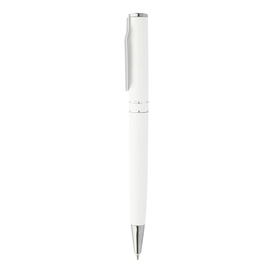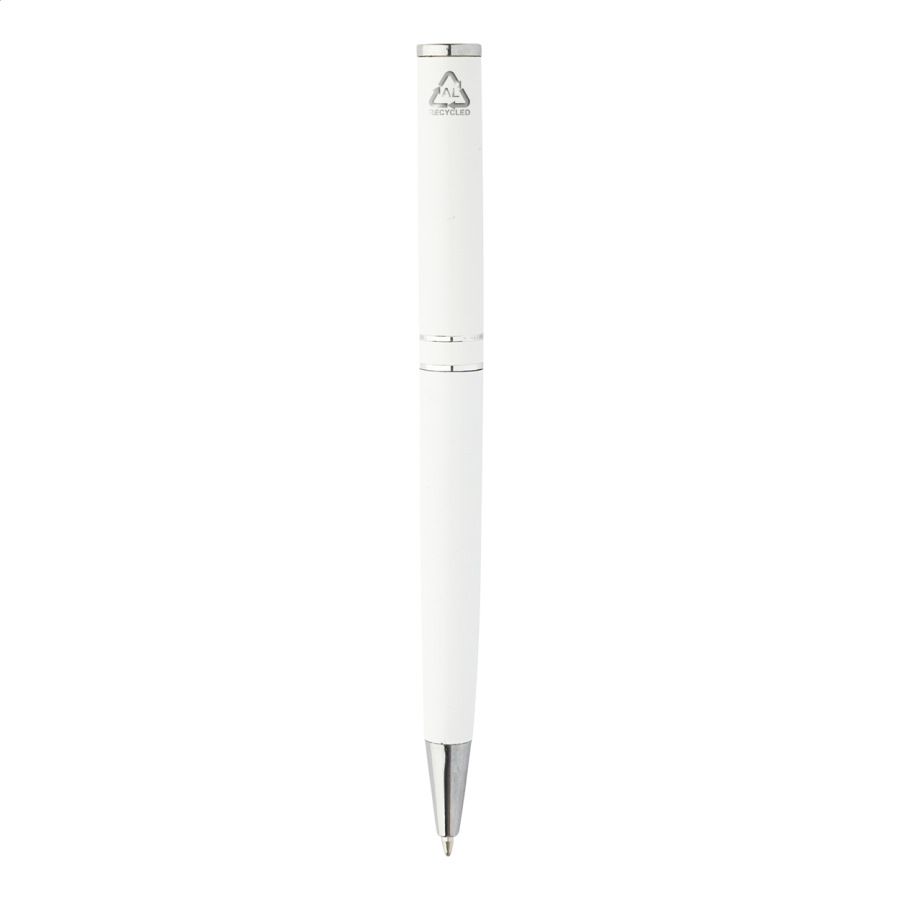 Guľôčkové pero z recyklovaného hliníka s chrómovanými časťami a krúžkami. V čiernej darčekovej krabičke. S modrou náplňou.