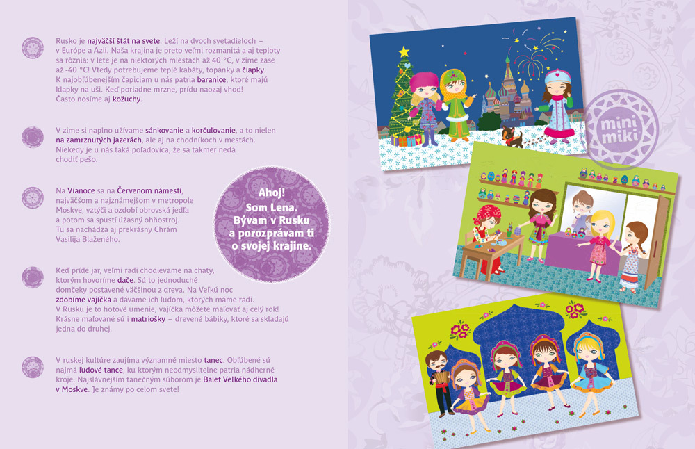 Knižky z kolekcie minimiky patria dlhodobo k našim najpredávanejším. Predstavujú tým úplne najjednoduchším a zároveň hravým spôsobom módu a niečo z kultúry cudzích krajín. Deti vďaka nim poodhalia každodenný život ľudí z najrôznejších kútov sveta, ich zvyky alebo navštívia zaujímavé miesta. Vďaka tomu získajú a upresnia si svoje predstavy o cudzej krajine, jej obyvateľoch, folklóre či móde. Viac ako 300 prekrásnych farebných samolepiek, atraktívne obrázky a dvojjazyčné texty, urobia ich spoznávanie ešte zaujímavejším a komplexnejším.