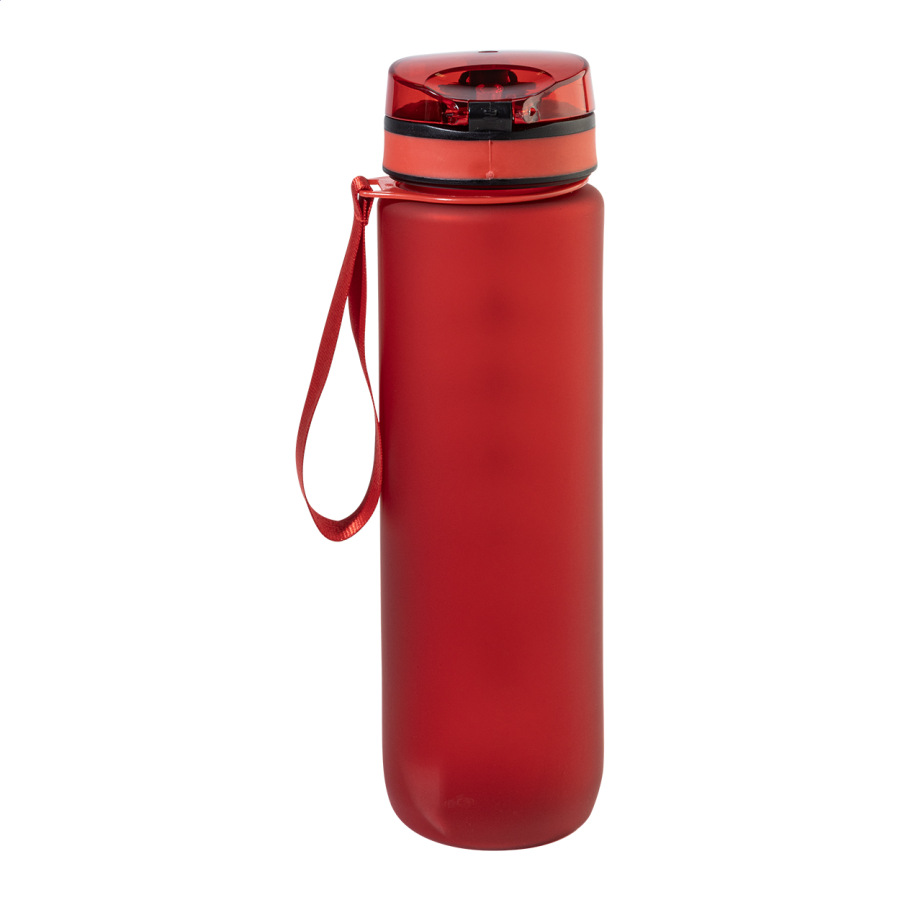 Športová fľaša z matného RPET s motivačným objemovým a časovým značením, s automaticky otvárateľným odklápacím viečkom s bezpečnostným zámkom a pútkom na nosenie. 1000 ml. Bez BPA. Nevhodné pre sýtené nápoje.