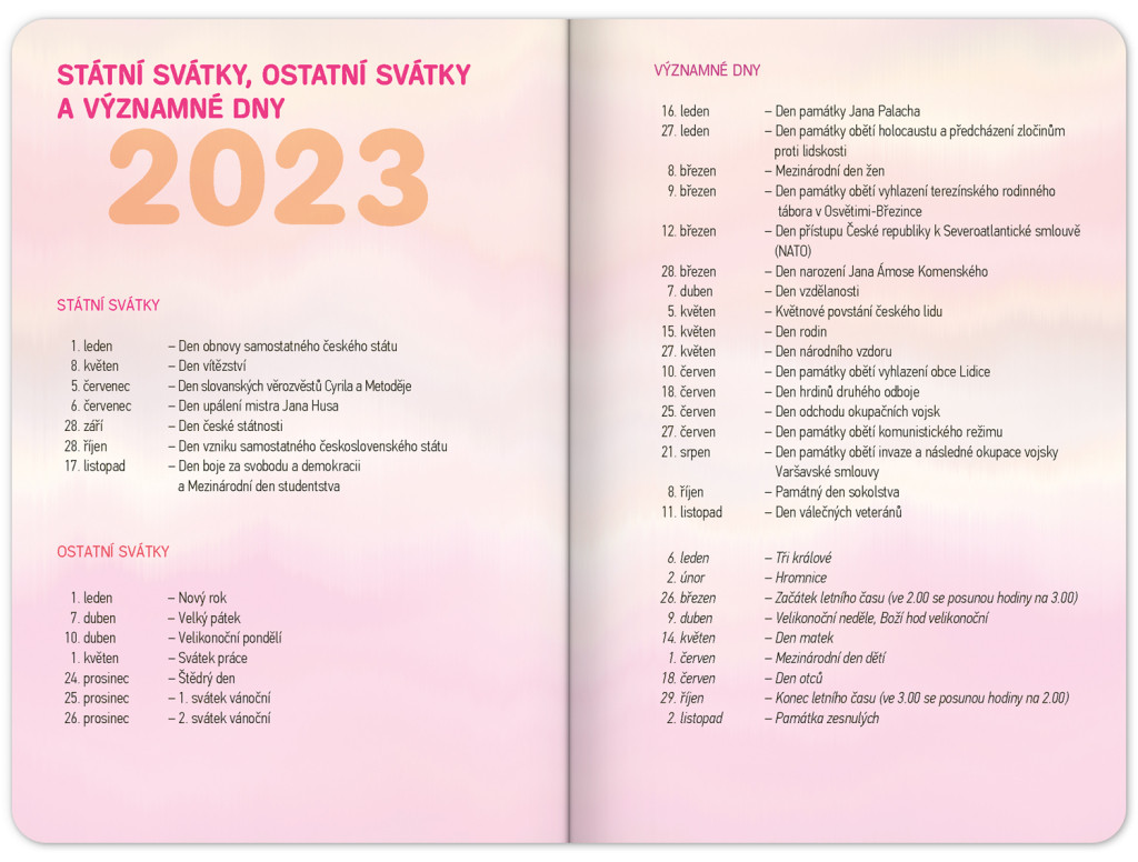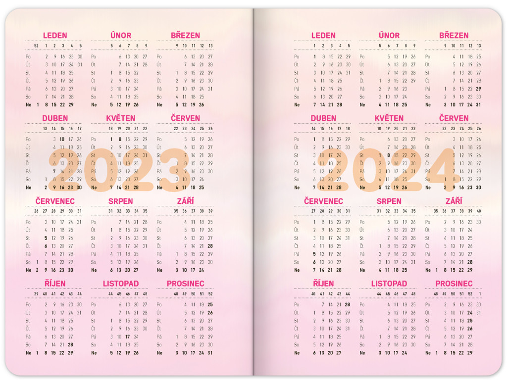 Školský diár Ružové pruhy (september 2023 – december 2024), 9,8 × 14,5 cm