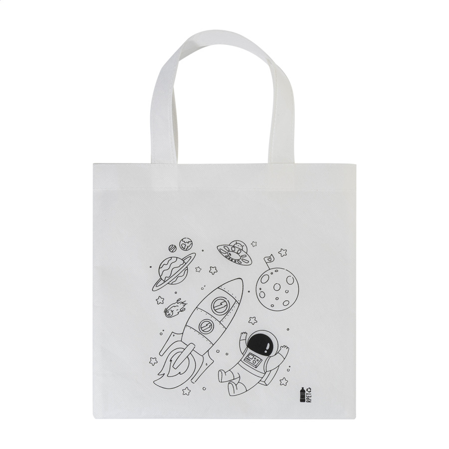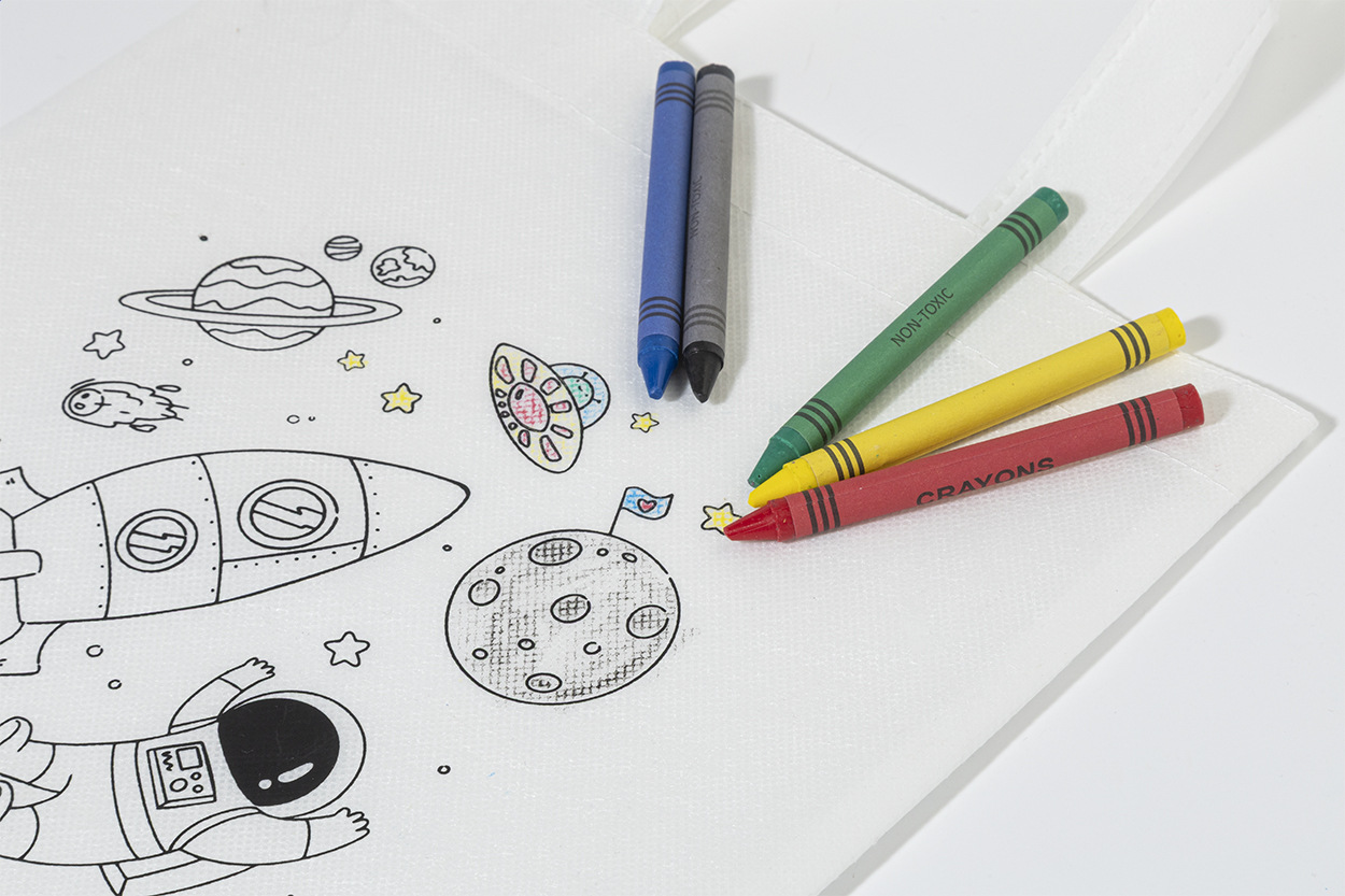 Mini nákupná taška z netkanej RPET tkaniny s 5 voskovkami na vyfarbenie.