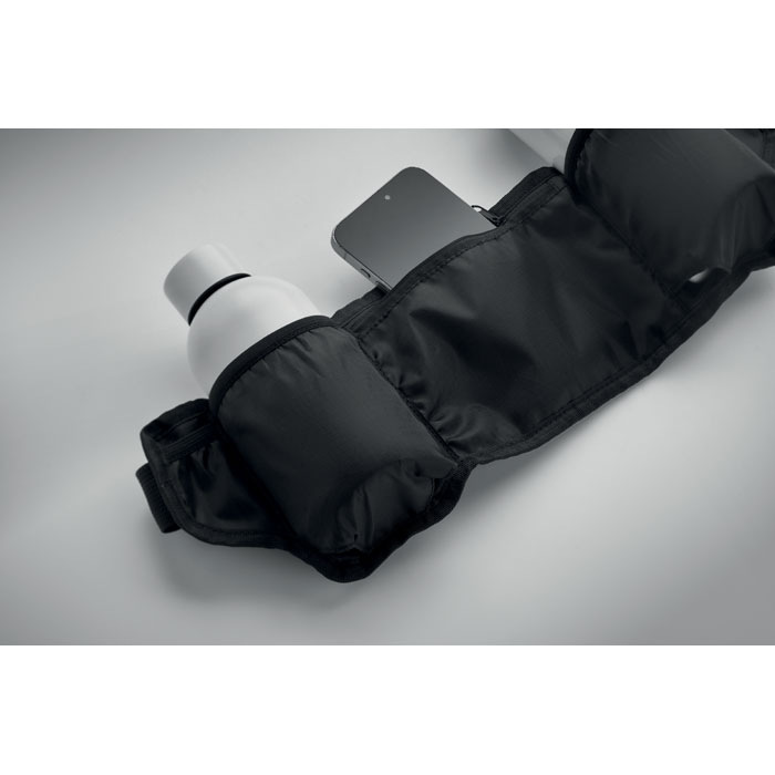 Sportovní ledvinka na běhání a turistiku vyrobená z polyesteru 420D RPET se síťovanými zády. Má dvě přihrádky na lahve, centrální kapsu na zip a nastavitelný popruh. Lehká a odolná.