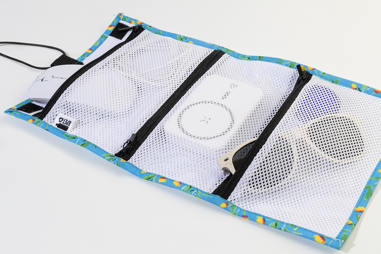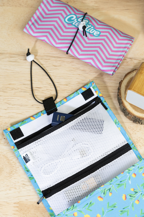 Rolovacia taška na káble na zákazku z RPET s 3 sieťovanými vreckami na zips a elastickým zapínaním. S celoplošnou sublimačnou potlačou. 600D RPET polyester s výrazným RPET štítkom. Cena nezahŕňa tlačovú prípravu. Min. mn.: 25 ks.