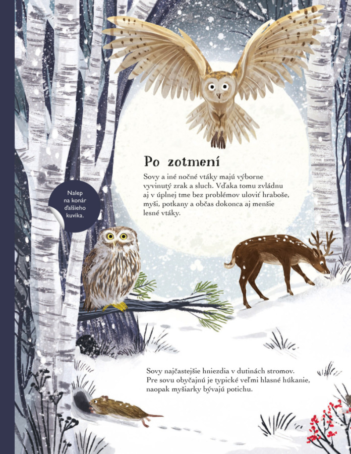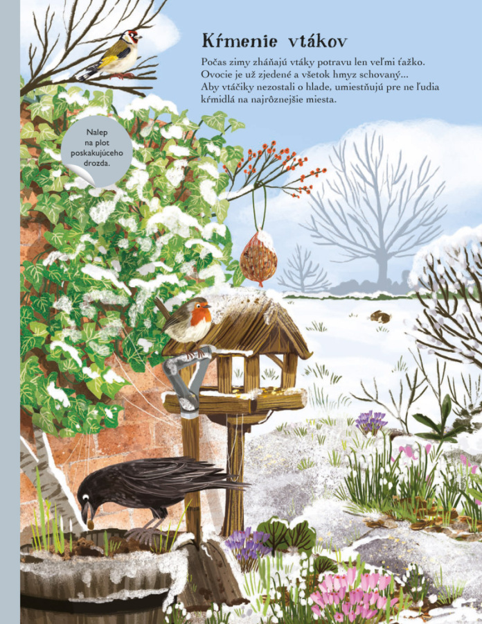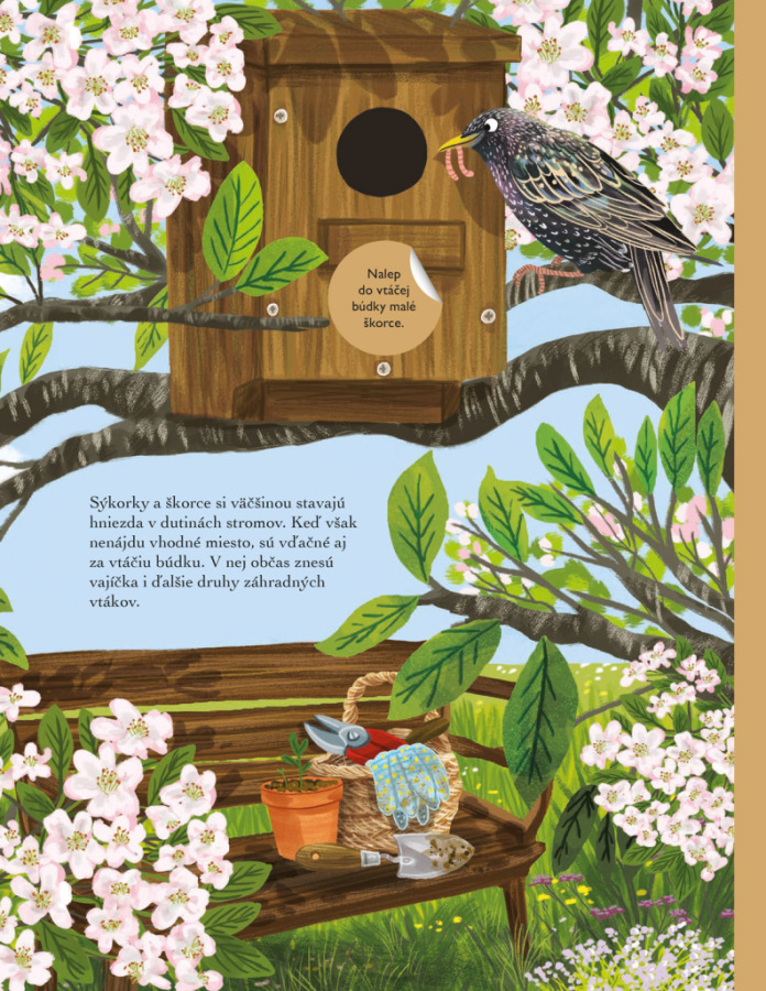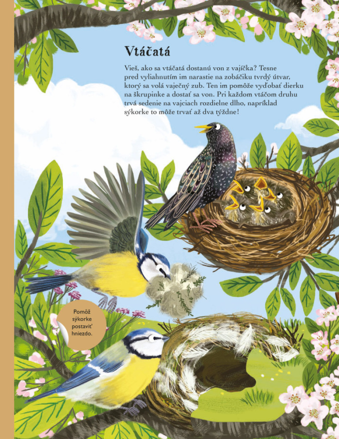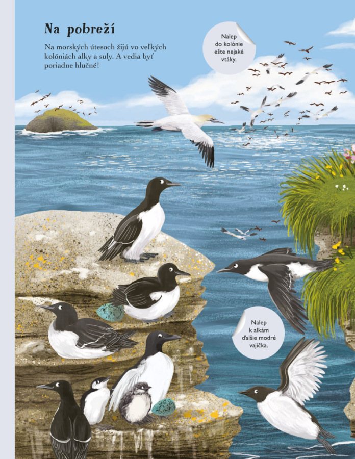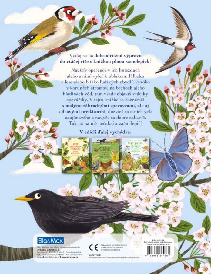 Vydajte sa na dobrodružnú výpravu do vtáčej ríše s knižkou plnou samolepiek! Navštívte operence v ich hniezdach, vydajte sa s nimi do oblakov… Hlboko v lese, či neďaleko ľudských obydlí, vysoko v korunách stromov, na brehoch alebo na hladinách vôd, tam všade objavíte vtáčiky speváčiky. V tejto knižke sa zoznámite s malými záhradnými spevákmi, ale aj dravými predátormi, dozviete sa o nich mnoho zaujímavostí a navyše zažijete plno zábavy pri dotváraní 11 prekrásnych prírodných scenérií pomocou rozkošných samolepiek.
