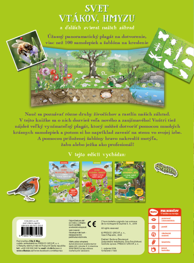 Naučte sa poznávať rôzne druhy živočíchov a rastlín našich záhrad! V tejto knižke sa o nich dozviete veľa nového a zaujímavého! Vnútri tiež nájdete veľký vynímateľný plagát, ktorý môžete dotvoriť pomocou mnohých krásnych samolepiek a potom si ho napríklad zavesiť na stenu vo svojej izbe. A pomocou priloženej šablóny hravo nakreslíte nakreslíte motýľa, žabu alebo ježka ako profesionál!