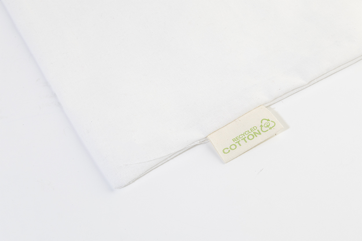 Nákupná taška s dlhými ušami zo 70% recyklovanej bavlny a 30% RPET polyesteru, 140 g/m². S výraznou etiketou o recyklovanej bavlne.