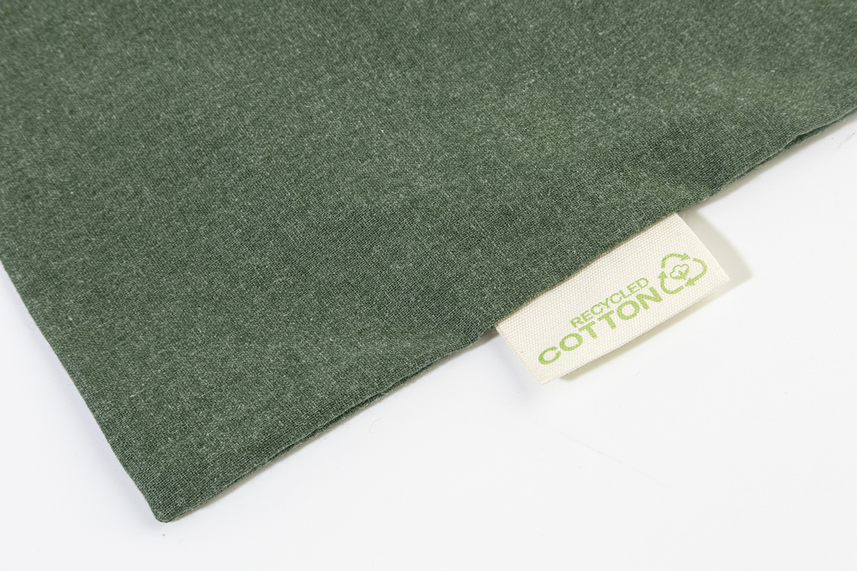 Nákupná taška s dlhými ušami zo 70% recyklovanej bavlny a 30% RPET polyesteru, 140 g/m². S výraznou etiketou o recyklovanej bavlne.