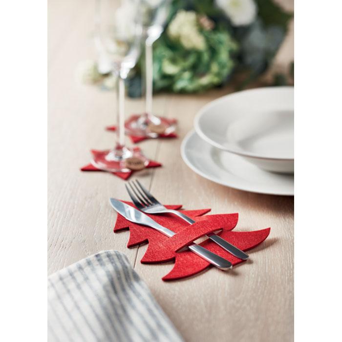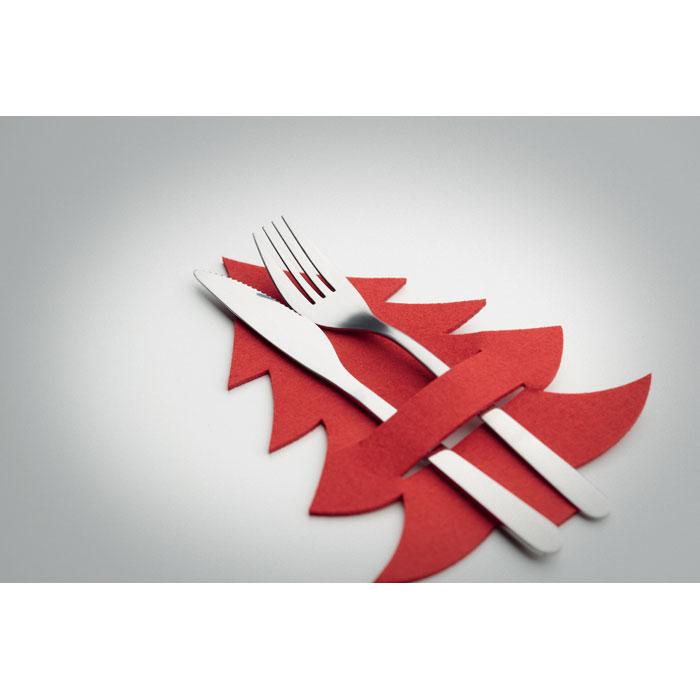 Sada 4 RPET plstěných držáků příborů. Tvar vánočního stromku, baleno v kraftové krabičce.