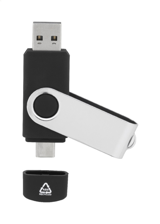 Otočný USB flash disk OTG v puzdre z recyklovaného ABS a kovu s pamäťou 8/16/32 GB. S pripojeniami USB a USB-C. USB 2.0.