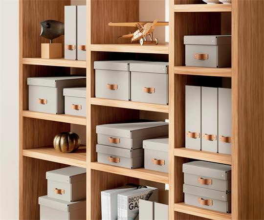 Štýlová kožená rukoväť uľahčuje vyberanie kartónových úložných boxov z políc, úložných či šatníkov.