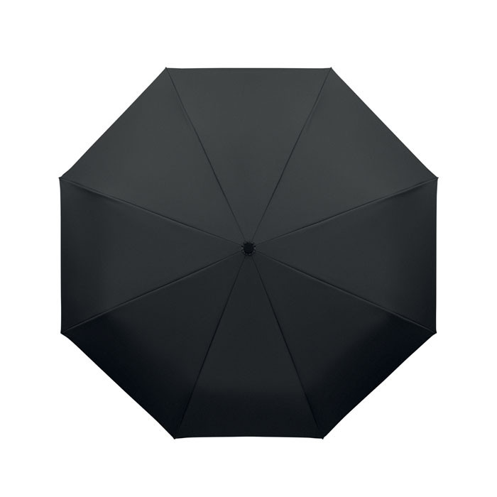 Skládací 21'' větruodolný deštník s černě pokovenou tyčí. Sklolaminátová žebra. Panely z pongee 190T RPET. Rukojeť s karabinou a pogumovanou úpravou. Automatické otevírání a zavírání. Včetně pouzdra.