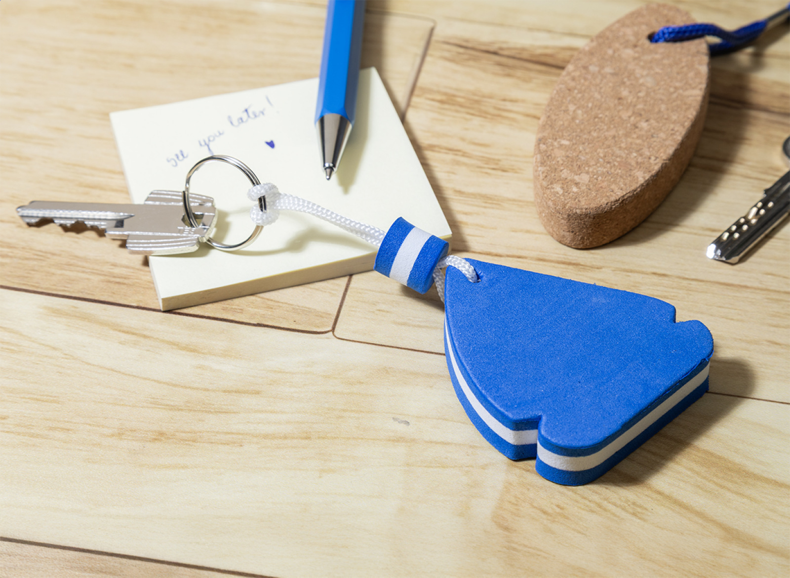 Plávajúci prívesok na kľúče z EVA peny v tvare plachetnice s kovovým krúžkom.