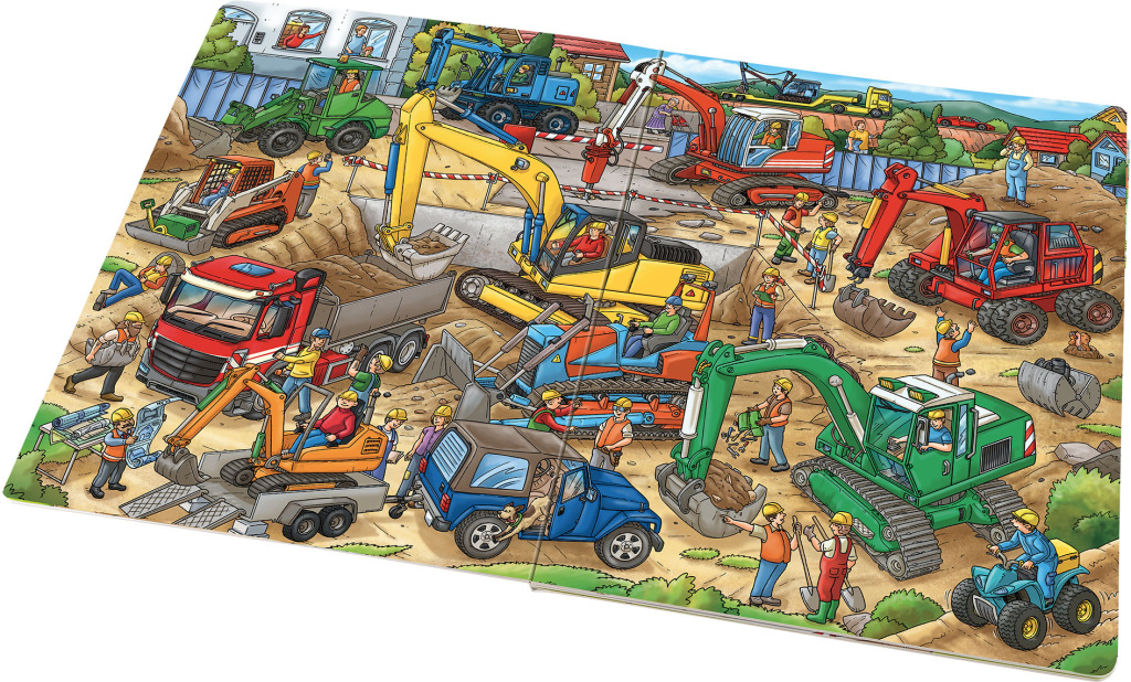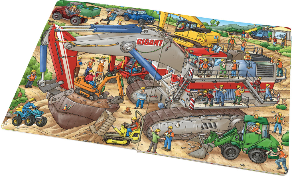 Toto veľkoformátové obrázkové leporelo ocenia predovšetkým fanúšikovia náklaďákov, bagrov, rýpadiel a ďalších strojov, ktoré pomáhajú všade tam, kde vzniká niečo nové. Červený bager s dvojitými pneumatikami, zelený kolesový nakladač, oranžový mini bager, žlté pásové rýpadlo,… rozmanitá technika vykonáva tie najnáročnejšie práce. A tiež je tu potrebných množstvo ľudí, ktorí vedia prácu strojov naplánovať, a aj tých, ktorí ich dokážu obsluhovať! Keď sa budete dobre pozerať, objavíte niektoré stroje a hrdinov na každej stránke a môžete tak sledovať ich príbehy.