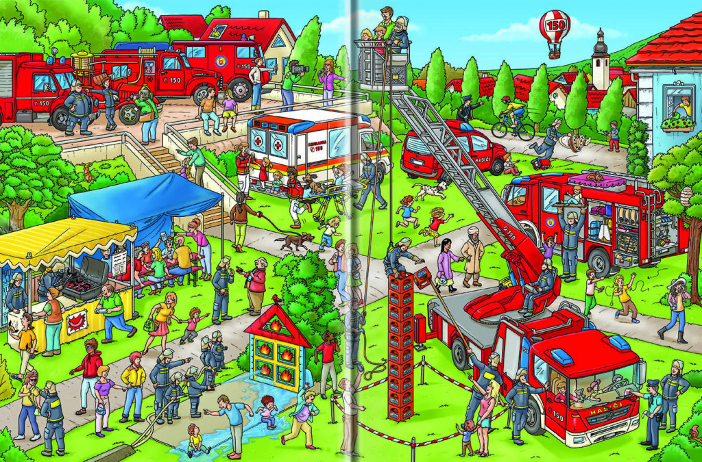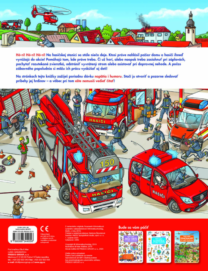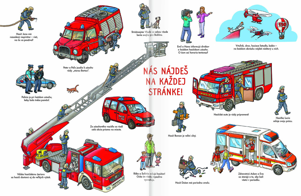 Hórí, hórí, hórí! Pozor – práve bol nahlásený požiar a hasiči vyrážajú do akcie! Rútia sa so zapnutou húkačkou k horiacemu domu. Rýchlo pripraviť dlhý hasičský rebrík a striekačky a hasíme! Je potrebné vyslobodiť z plameňov nešťastníkov, ktorí nestihli včas utiecť pred ohňom. Hasiči ale nepomáhajú len pri požiaroch. Poradia si aj pri záplavách, prídu pochytať zvieratká, ktoré utiekli, odpratať vyvrátený strom alebo asistovať pri dopravnej nehode. A počas zábavného popoludnia si môžu ich prácu vyskúšať aj deti! Detailné ilustrácie v ďalšej z radu veľkých obrázkových kníh oboznámi malých čitateľov s rozmanitou prácou hasičov aj životom na stanici. Stačí sa len ponoriť do farebného sveta obrázkov a pozorne sledovať.