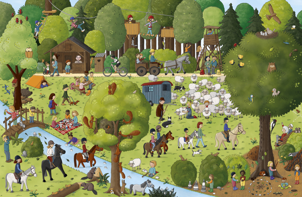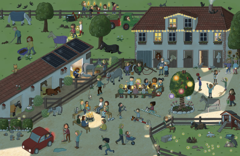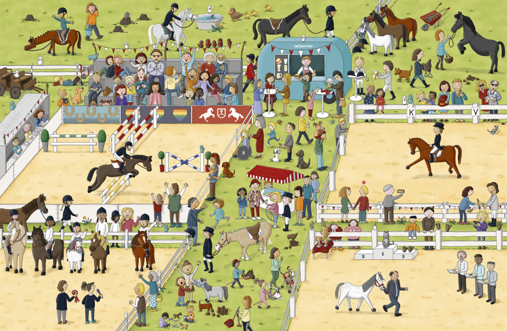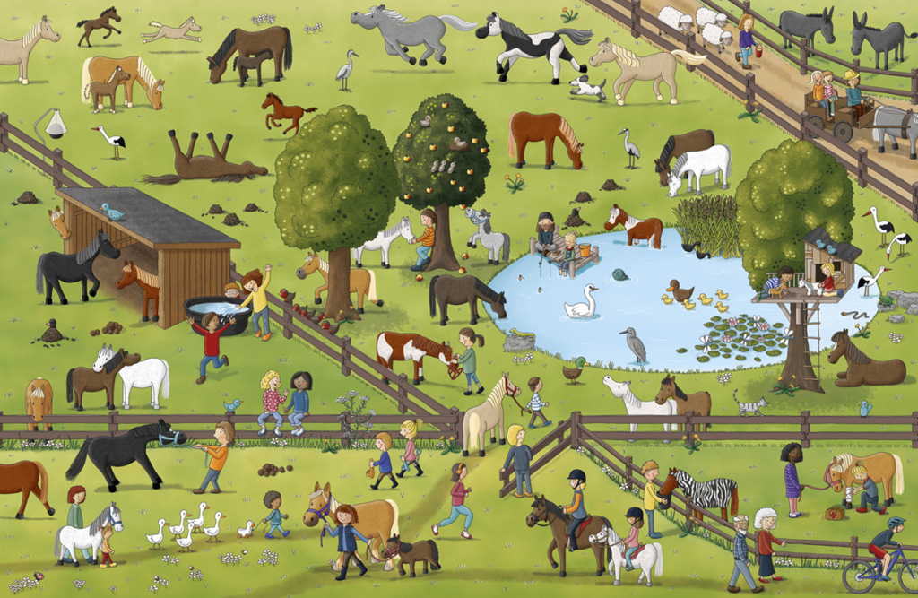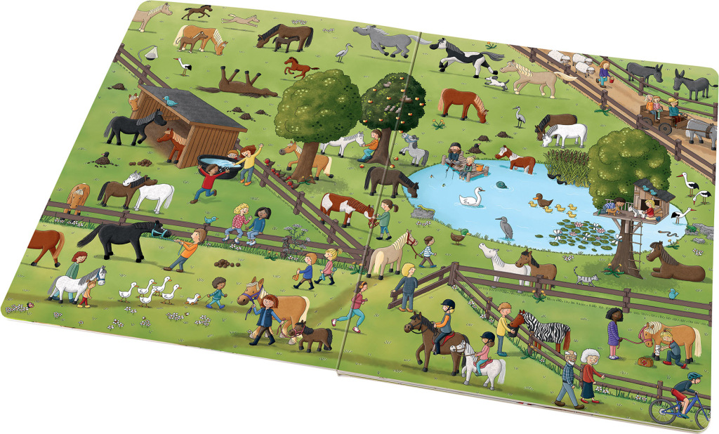 V tejto veľkej obrázkovej knižke prežijete úžasný deň medzi koňmi a poníkmi. Na veľkoformátových ilustráciách môžete obdivovať tieto krásne a ušľachtilé tvory. Nahliadnite do každodenného života na konskej farme: vyrazíte na výlet, budete ich povzbudzovať na dostihoch alebo sledovať žrebce, kobyly a žriebätká na paši. Zistíte, čo všetko obnáša starostlivosť o tieto zvieratá, čo majú rady alebo pri akých činnostiach môžu človeku pomáhať. Niektoré postavičky a zvieratká môžete hľadať na každej dvojstránke znova a znova a sledovať ich príbehy. Je to celkom fuška, ale hlavne, veľká zábava!