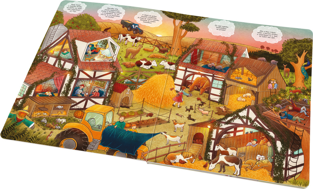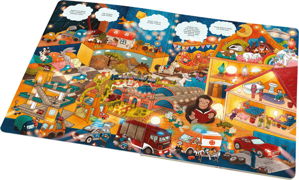 Je čas ísť do postele? Tak potom je ten správny čas siahnuť po tejto kúzelnej obrázkovej knižke! Nájdete v nej bohatú inšpiráciu na každodenné rozprávanie na dobrú noc… Napríklad o tom, ako sa ukladajú na spánok zvieratká na farme. A tiež ľudia, ktorí sa o ne starajú. V čom je to iné v meste? Alebo dokonca hlboko v lese? Ako nocujú divé zvieratá? A čo robia hračky v obchode, keď všetko okolo spí? Pozrite sa, ako ožíva rozprávkový svet. S touto knižkou sa doňho môžete vydávať znova a znova. Dobrú noc a sladké sny!