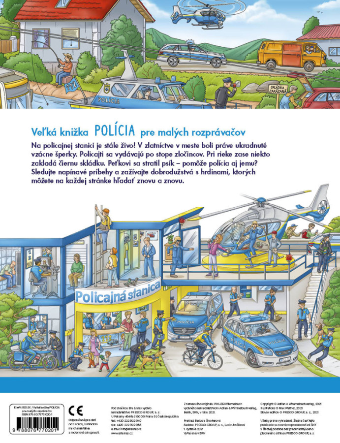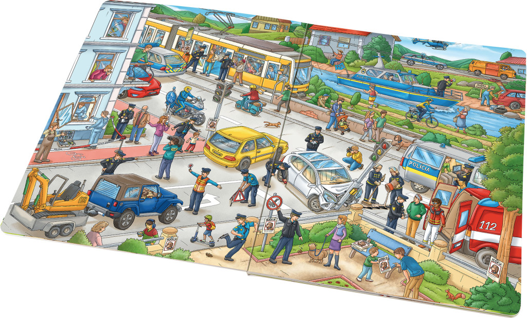 Na policajnej stanici je stále živo! Zo zlatníctva v meste boli práve ukradnuté vzácne šperky a policajti sa vydávajú po stope zločincov. Pri rieke zas niekto akurát zakladá čiernu skládku a Peťovi sa stratil psík. Pomôže polícia aj s tým? Sledujte všetky napínavé príbehy, ktoré sa rozohrávajú na stránkach tohto úžasného veľkoformátového leporela a zažívajte dobrodružstvá s hrdinami, ktorých môžete na každej dvojstrane hľadať znova a znova. Stačí sa len ponoriť do farebného sveta obrázkov a pozorne sa pozerať… Detailné ilustrácie priblížia malým čitateľom rozmanitú prácu policajtov a každodenný život na stanici.