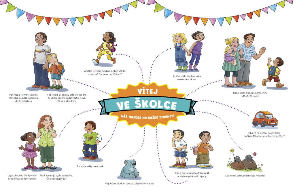 S touto veľkou obrázkovou knižkou prežijete úžasný deň v materskej škôlke, kde je stále živo! Ráno sem mamičky a oteckovia privedú deti a až potom začne tá pravá zábava! Niekto sa hrá, niekto tvorí, iní sa učia, spievajú alebo cvičia. A potom všetci, hurá! von – aj tam totiž čaká plno dobrodružstiev… Čo takto krátky výlet za zvieratkami na farmu? Ale zabudnúť nesmieme ani na povinnosti: pekne sa spoločne najesť, umyť a ísť si po obede zdriemnuť. A na zajtra sa môžeme tešiť na ďalšie stretnutia s kamarátmi. Aj malí čitatelia môžu prežívať škôlkarské dobrodružstvá znova a znova – stačí otvoriť knižku a začať listovať od začiatku!