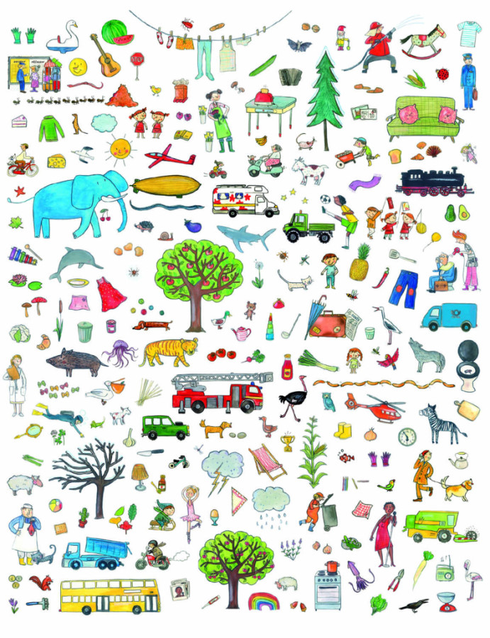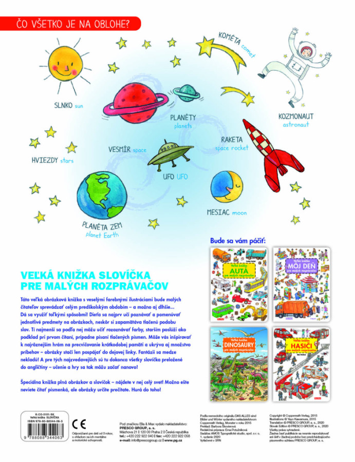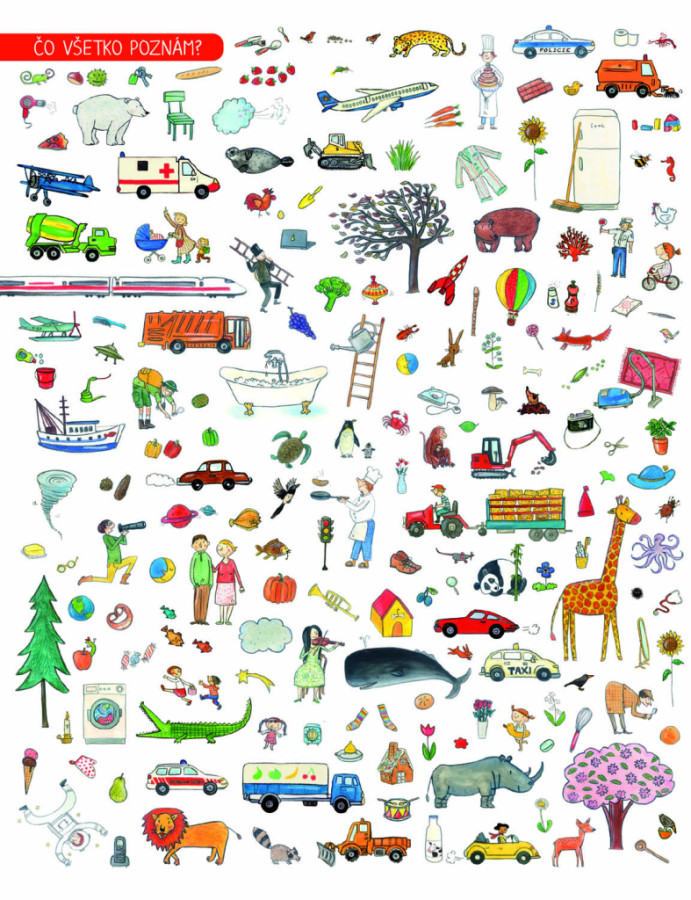 Táto veľká obrázková kniha s veselými farebnými a „čítavými“ ilustráciami môže malých čitateľov sprevádzať celým predškolským obdobím a možno ešte dlhšie... Ponúka nepreberné možnosti využitia. Dieťa sa najprv učí poznávať a pomenovávať jednotlivé predmety na obrázkoch, neskôr si zapamätáva tlačenú podobu slov. Tí najmenší sa podľa naj môžu učiť rozpoznávať farby, starším poslúži ako podklad k prvému čítaniu, prípadne písaniu tlačených písmen. Môže vás ďalej inšpirovať k najrôznejším hrám na precvičovanie krátkodobej pamäte a tiež ukrýva množstvo príbehov – obrázky stačí len pospájať do dejovej línie – fantázii sa medze nekladú! A pre tých najzvedavejších sú tu dokonca všetky slovíčka preložené do angličtiny – a učenie aj hry môžu začať odznova!