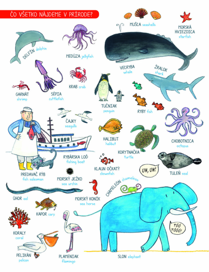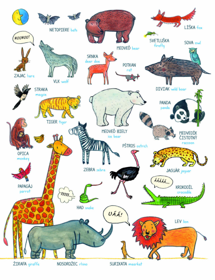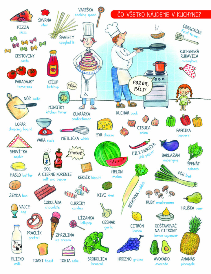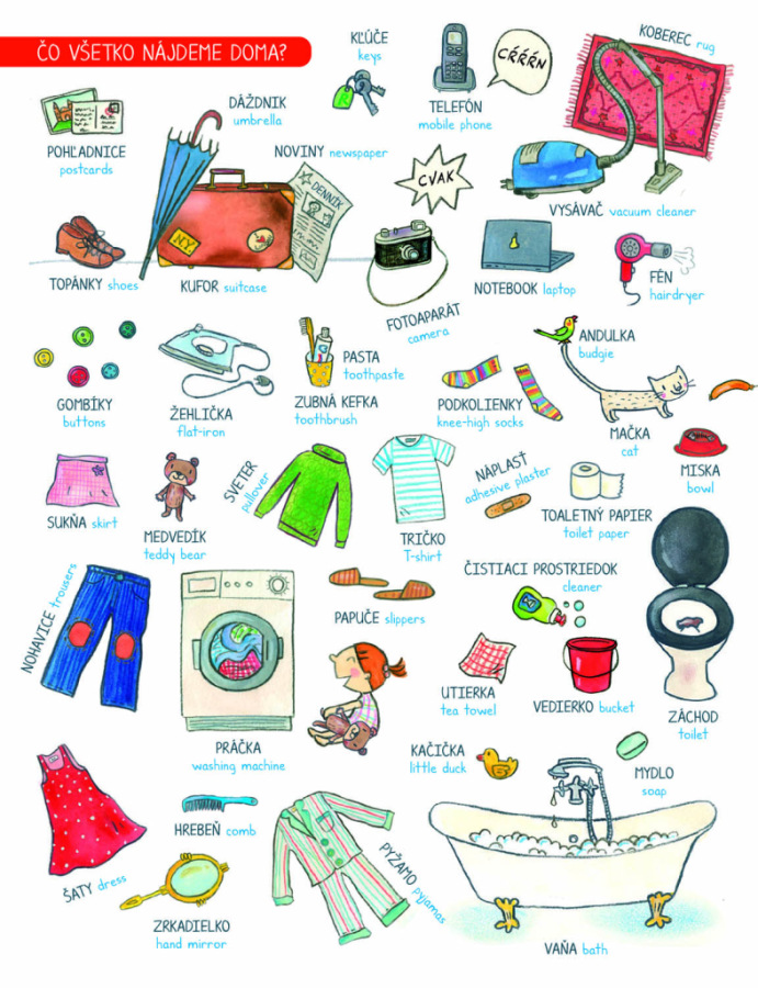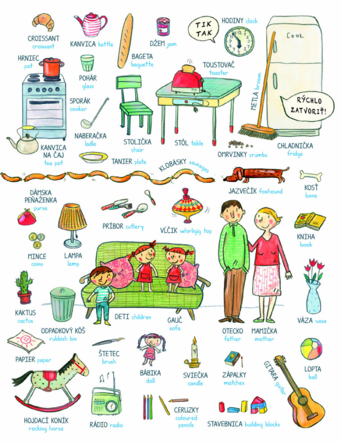 Táto veľká obrázková kniha s veselými farebnými a „čítavými“ ilustráciami môže malých čitateľov sprevádzať celým predškolským obdobím a možno ešte dlhšie... Ponúka nepreberné možnosti využitia. Dieťa sa najprv učí poznávať a pomenovávať jednotlivé predmety na obrázkoch, neskôr si zapamätáva tlačenú podobu slov. Tí najmenší sa podľa naj môžu učiť rozpoznávať farby, starším poslúži ako podklad k prvému čítaniu, prípadne písaniu tlačených písmen. Môže vás ďalej inšpirovať k najrôznejším hrám na precvičovanie krátkodobej pamäte a tiež ukrýva množstvo príbehov – obrázky stačí len pospájať do dejovej línie – fantázii sa medze nekladú! A pre tých najzvedavejších sú tu dokonca všetky slovíčka preložené do angličtiny – a učenie aj hry môžu začať odznova!