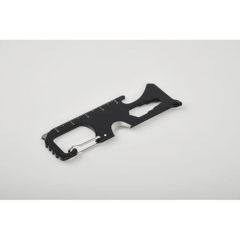 Univerzální kapesní nářadí a klíčenka z nerezové oceli. 8 funkcí: pilka, řezačka drátu, klíč, křížový šroubovák, plochý šroubovák, měřící stupnice a otvírák na láhve.