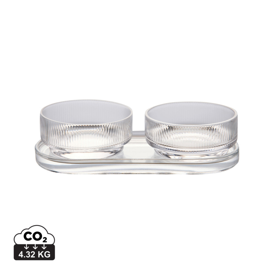 Sada na tapas s nadčasovým dizajnom a klasickými, čistými líniami. Ideálna na každú príležitosť, kde chcete štýlovo a elegantne servírovať malé jedlá, občerstvenie alebo iné prílohy. Sada obsahuje dve misky a podnos, ktoré sa dajú používať spoločne alebo samostatne. Vyrobené zo sódovo-vápenatého skla. Misky majú objem 250 ml. Vhodné do umývačky riadu.