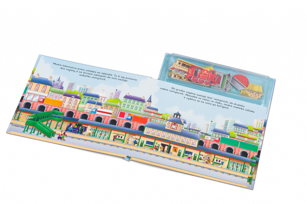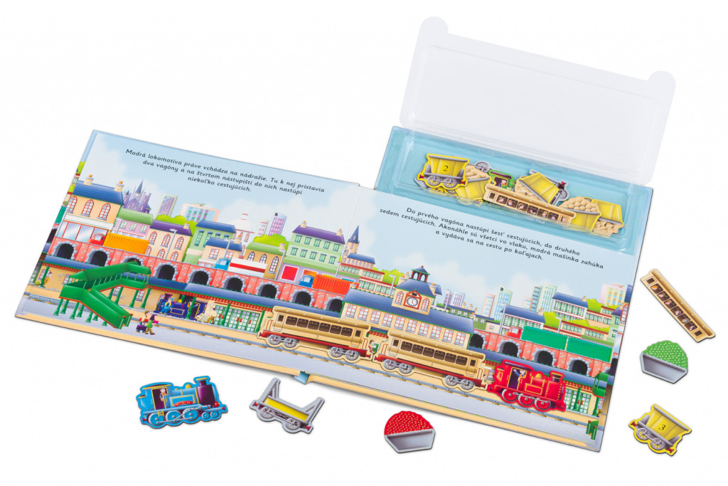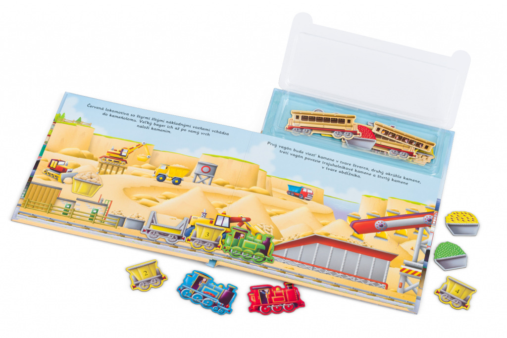 Húúú, húúú – pozor, prichádza vlak! V prístave, na železničnom nádraží, na stavbe a po náročnom dni aj v depe – tam všade nájdeme lokomotívy a vagóny na osobnú alebo nákladnú prepravu. Tam všade nám vláčiky pomáhajú. Na každej stránke tejto knižky objavia deti kratučký príbeh, ktorý môžu spoluvytvárať pomocou magnetiek. A keď sa do sýtosti vyhrajú, môžu všetky vozne opäť „zaparkovať“ nazad do úložného boxu, kde budú pripravené na ďalšiu skvelú zábavu.